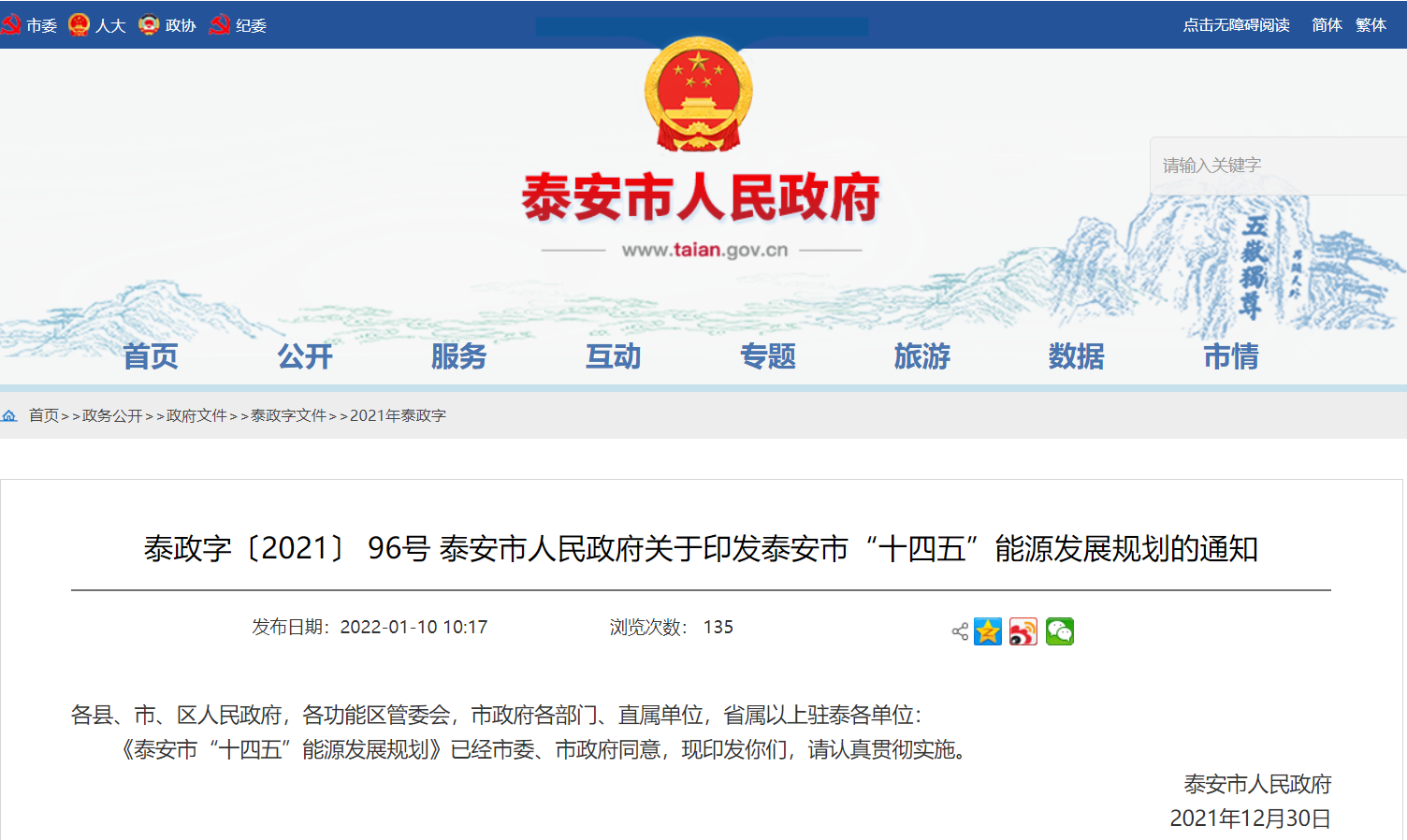 文章來源:地大熱能 發布作者:山東省泰安市人民政府 發表時間:2022-01-12 09:06:56瀏覽次數:4327