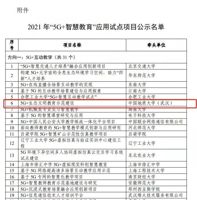 地大新聞網訊:近日,工業和信息化部、教育部聯合公示2021年“5G+智慧教育”應用試點項目入圍名單,我校牽頭申報的“5G+生態文明教育示范建設”項目成功入選。“5G+智慧教育”應用試點項目是工業和信息化部、教育部為貫徹落實黨中央、國務院關于加快5G發展、加強教育信息化工作的決策部署,旨在遴選一批利用5G網絡的教育信息化最佳實踐和解決方案,推進5G與教育的雙向賦能和融合創新,推動教育模式變革和教育生
